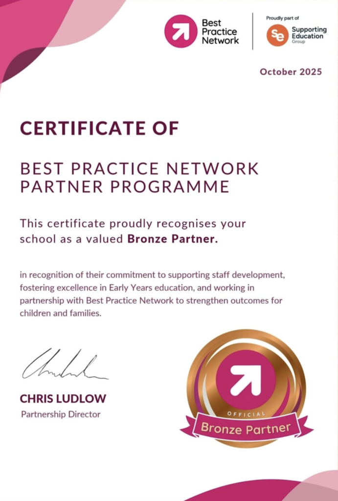 Chicksand Nursery has been officially recognised as a Bronze Partner. This certificate celebrates our commitment to supporting staff development, fostering excellence in Early Years education, and working in partnership with Best Practice Network to strengthen outcomes for children and families.